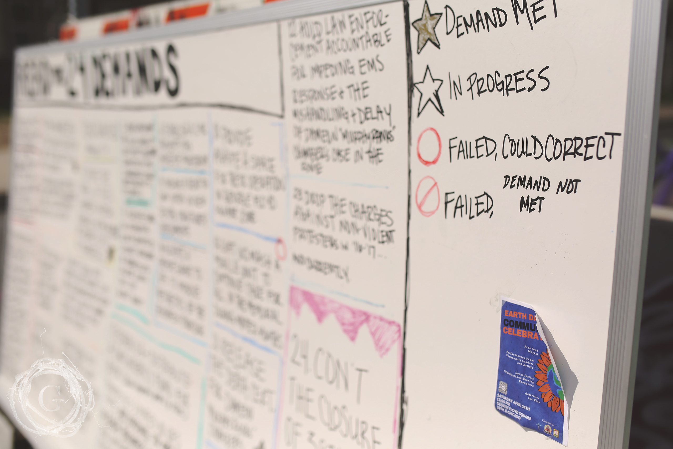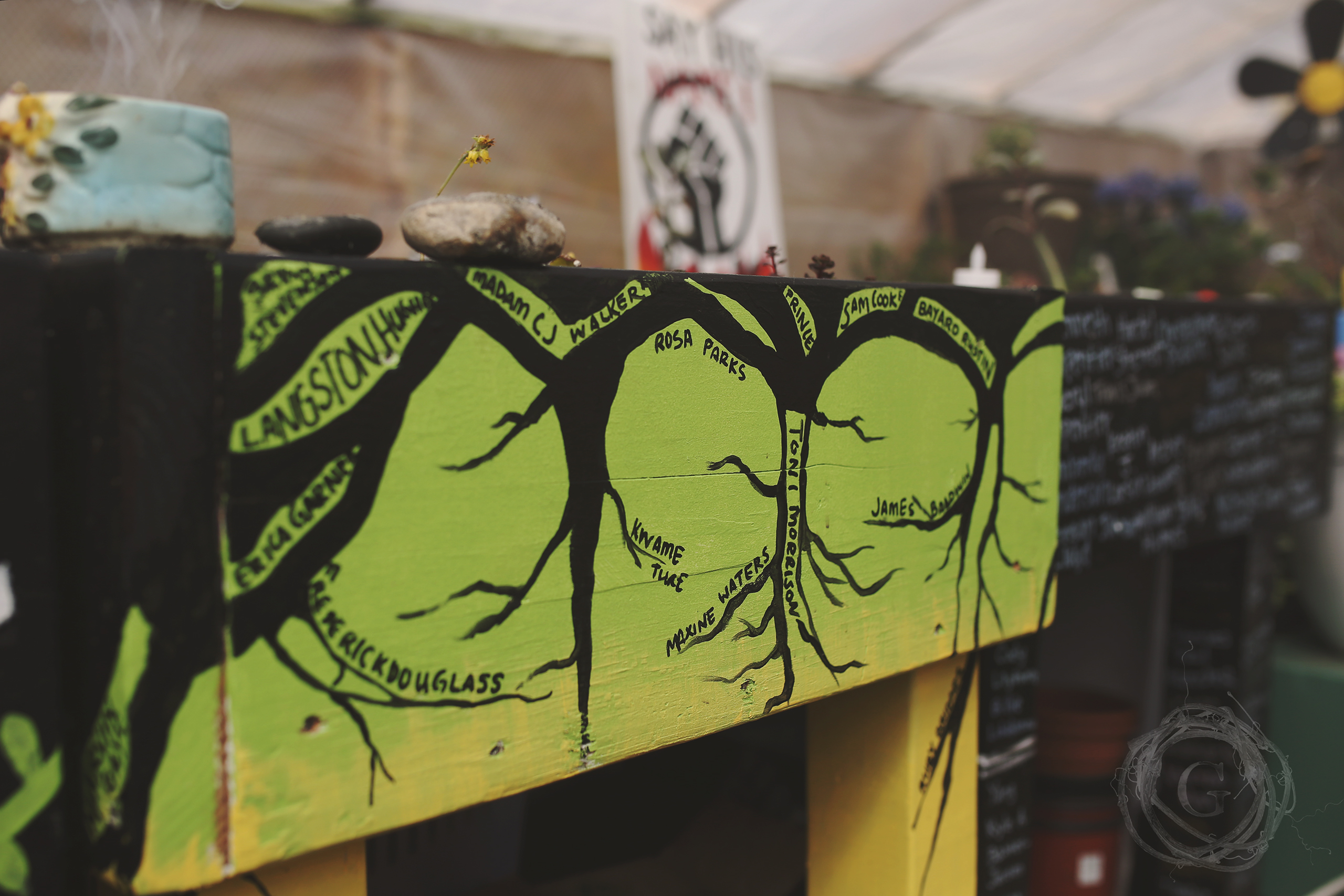 You know that community healing is at the center of the work because there are resources for all their needs. Books. Food. Security. A bonfire. Access to the business. Vegetables. Providing food and growing gardens. There are memorials to remember, and dedicated spaces that speak to life.